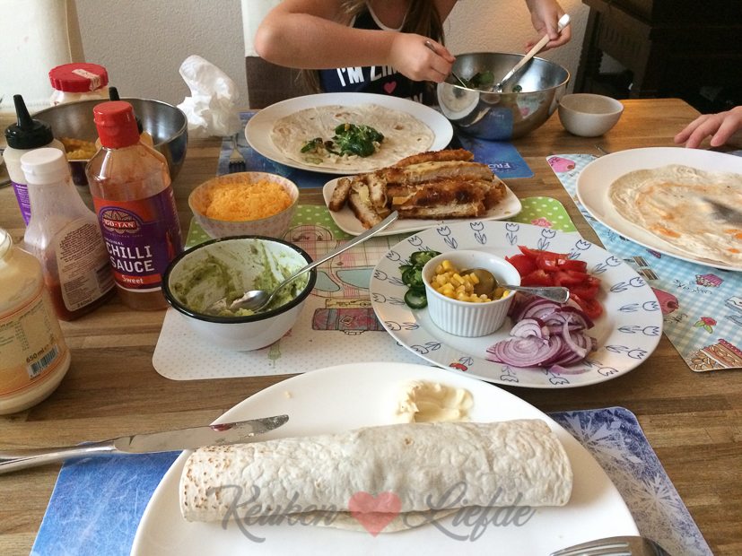 We eten wraps met kipschnitzelreepjes (een variant op deze honing-mosterdwraps), guacamole, cheddar, sla en ovenfriet.