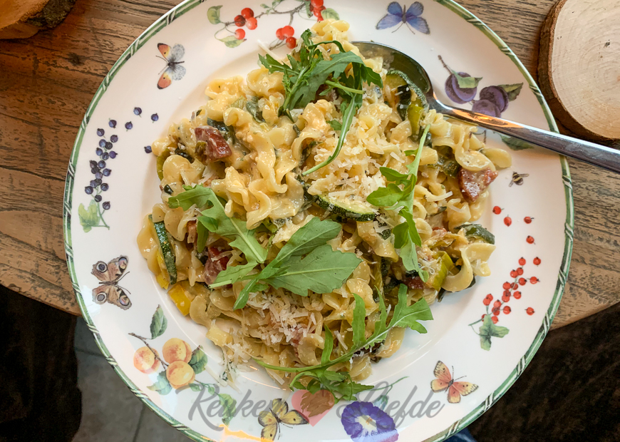 ’s Avonds maak ik een lekkere pasta carbonara met prei, courgette en chorizo.