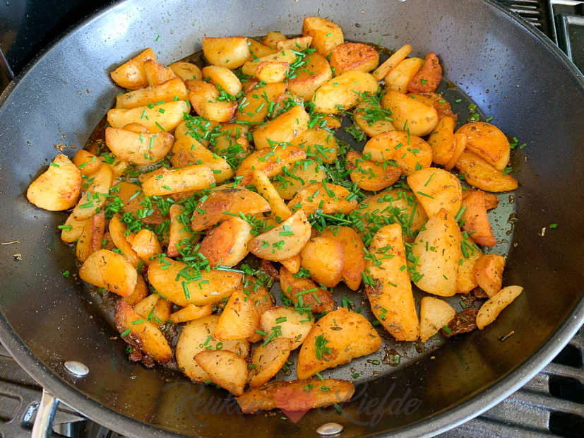 - Voorgekookte aardappelpartjes met paprikapoeder en gedroogde rozemarijn en tijm bakken in de paellapan op de bbq