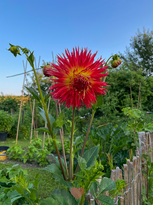 De dahlia’s die voor de moestuin tegen het schapenhek staan beginnen nu ook volop te bloeien. Die weelderige vormen en felle kleuren, ik hou van dahlia’s!