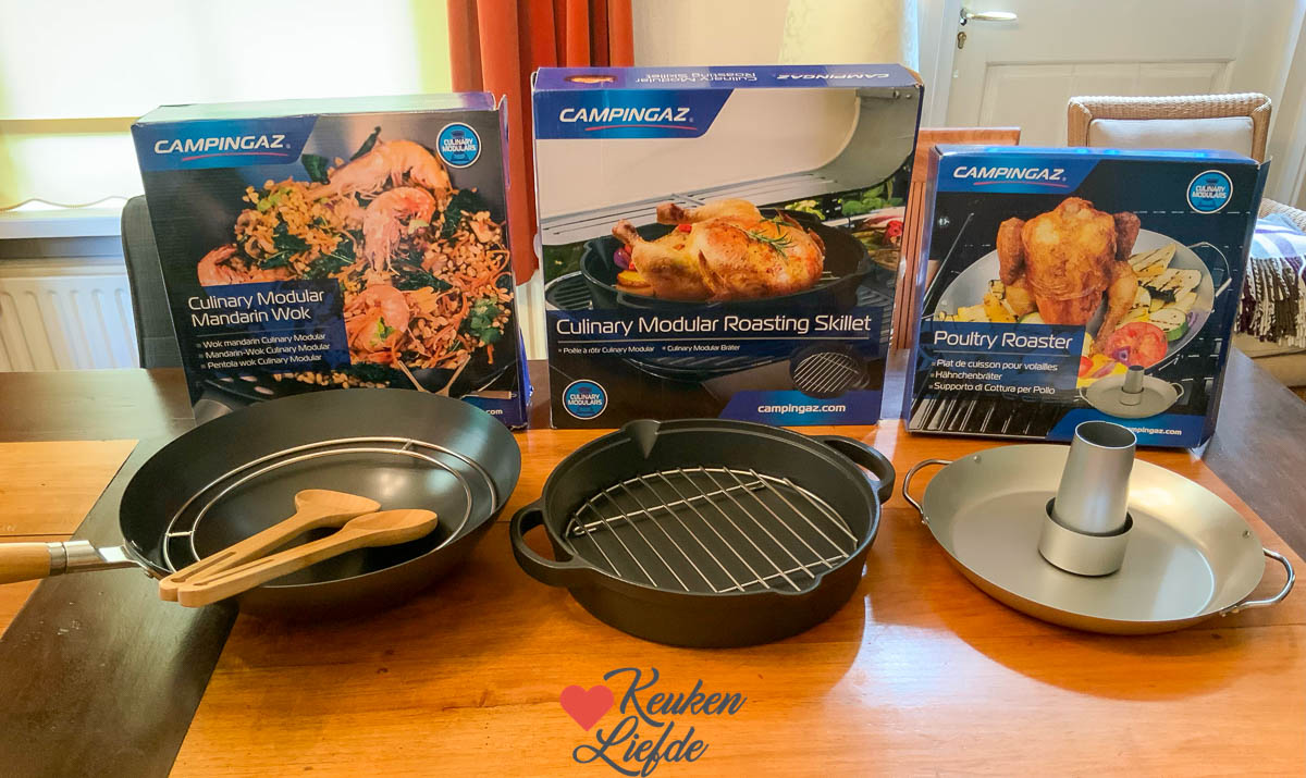 Van Campingaz mocht ik nieuwe barbecuepannen uitzoeken voor de Campingaz 4 Series Onyx S gasbarbecue die wij al een paar jaar hebben, en deze werden vandaag bezorgd. De Onyx S barbecue heeft een uitwisselbaar gietijzeren module waar je verschillende pannen in kunt zetten. Zo maakte ik eerder pizza op de pizzasteen, kip aan het spit en paella in de paellapan op de barbecue en dat smaakte naar meer. Het eerste recept in de wokpan (knoflookgarnalen) is inmiddels al gemaakt op de barbecue en was heerlijk. Ik ga de recepten snel met je delen! PS Je kunt alle recepten trouwens ook gewoon binnen in je keuken maken op het fornuis en/of in de oven. 🙂