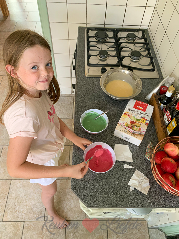 Johan zijn vakantie zit erop en Ella-Marie en ik zijn alleen thuis. Het is de laatste vakantieweek van Ella-Marie. Omdat het een druilerige dag is besluiten we maar wat lekkers te bakken… We maken een papegaaiencake van het bakblik uit een pak cakemix die we onlangs kochten in Duitsland.