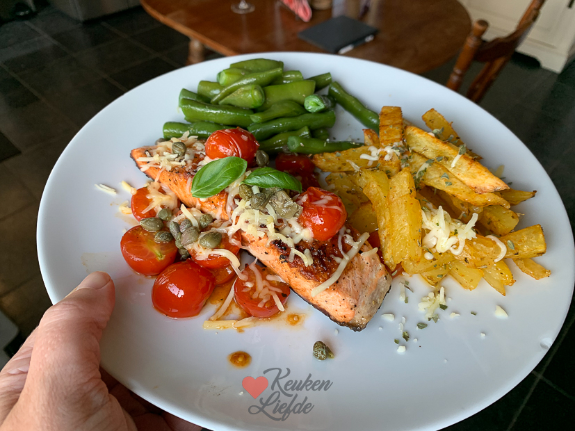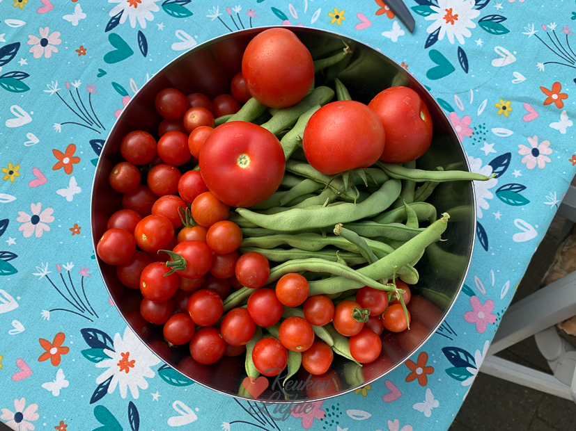 Johan is ’s ochtends alweer vroeg de deur uit voor zijn werk en ik heb (Ella is nog bij opa en oma) het rijk sinds lange tijd weer eens voor mezelf alleen. Zalig! Ik werk de hele dag op kantoor en bedenk en schrijf onder andere weer nieuwe recepten uit voor een kookdag binnenkort. Iets met tomaten en sperziebonen…. Die dingen blijven maar groeien! ’s Avonds eten we gekookte sperziebonen met zelfgeschilde frietjes van het bakblik en gebakken zalm met knoflook, tomaat en kappertjes. En ja, een klein beetje kaas.
