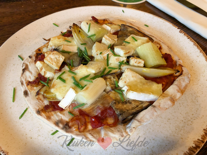 - Mijn (Annemiek) hoofdgerecht: flatbread van de Josper grill met Romesco-saus, gerookte hazelnoten, kaas en seizoensgroenten