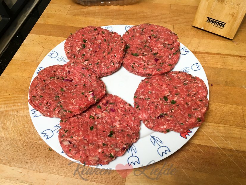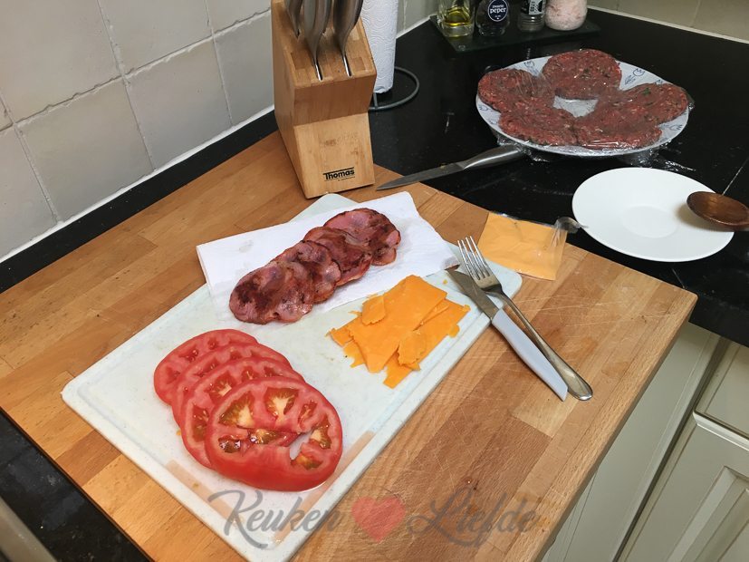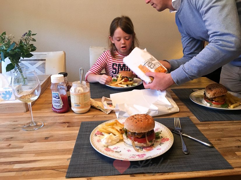 Ik maak broodje hamburger voor het avondeten. We halen er een zakje frietjes bij.