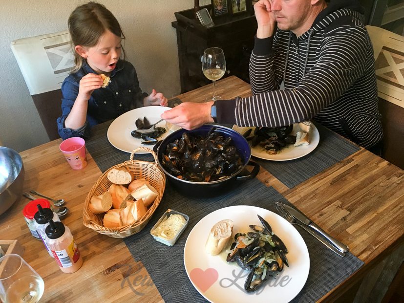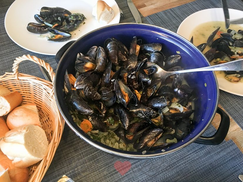 Johan kookt de mosselen op klassieke wijze met verse mosselgroenten, een zakje gedroogde mosselkruiden en witte wijn. We eten er stokbrood met kruidenboter bij.