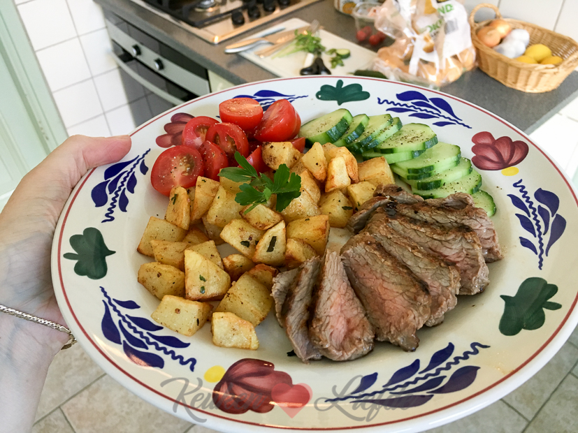 Om het feest compleet te maken op deze doodgewone donderdag eten we ook meteen maar biefstuk. Een kogeltje dan hè, dan doe je al gek genoeg…