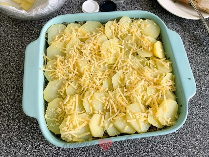 Voor het avondeten warm ik de ovenschotel op die ik gisteren maakte. Lekker met een tomatensalade met feta en wat extra strooikaas. 🙂
