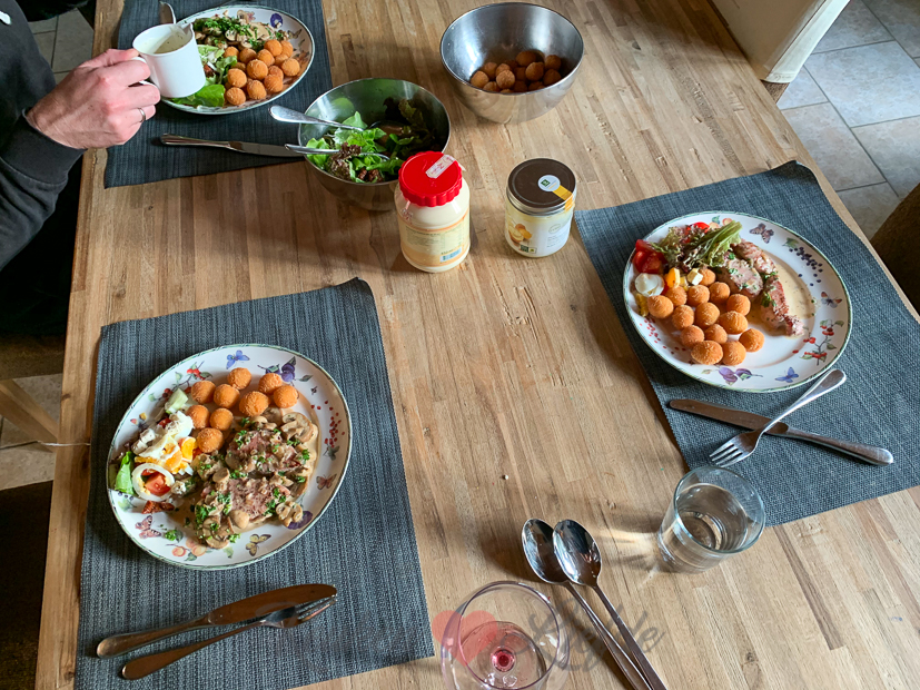 ’s Avonds eten we buiten op de loungeset zelfgebakken frietjes met snacks.