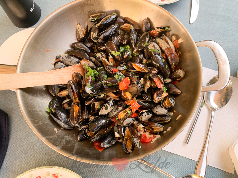 Tussendoor doen Ella-Marie en ik even een boodschapje bij de supermarkt. Er was een grote bak mosselen in de aanbieding, dus die en een stokbroodje neem ik mee voor het avondeten.