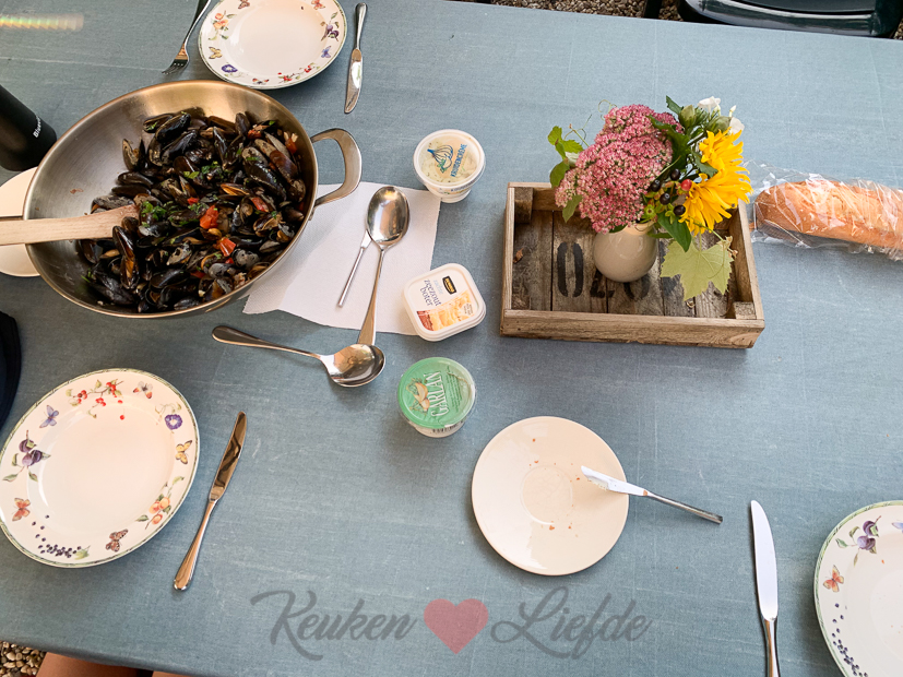 - Schoongemaakte mosselen erbij, wat citroensap, witte wijn en deksel op de pan