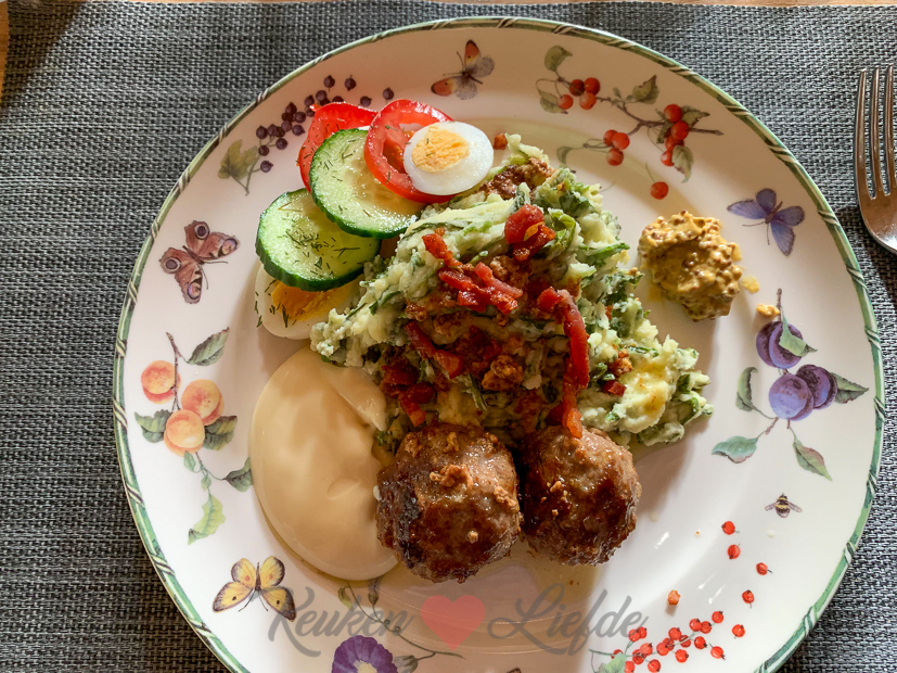 Vandaag kook ik wel. Ik maak sla-stamppot met gehaktballetjes en uitgebakken spekjes. Erbij serveer ik de Hollandse caprese waarvan ik het recept gisteren al met je deelde. Ook het recept voor de sla-stamppot met gehaktballetjes komt eraan!