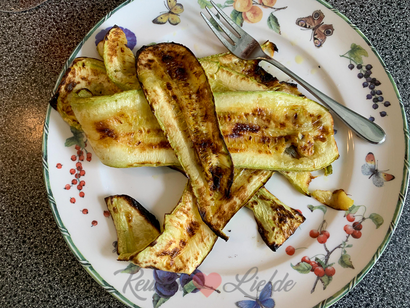 Als we thuiskomen duik ik de keuken in om eten te koken. Ik maak risotto met kippendijen en gegrilde courgette uit de moestuin.