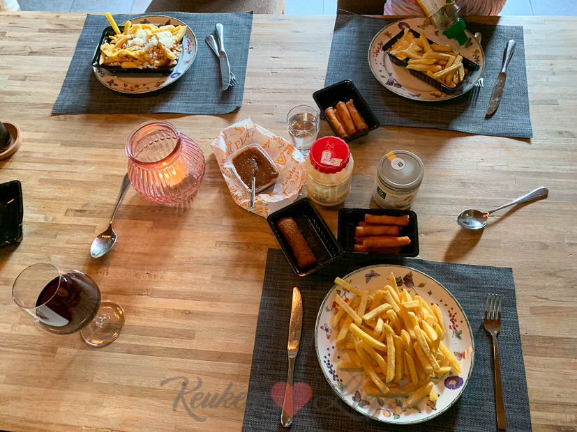 Aan het eind van de middag brengen mijn schoonouders Ella-Marie weer thuis en drinken we buiten nog een drankje. Als avondeten komen er frietjes en snacks uit de Airfryer op tafel die nog in de diepvries liggen.