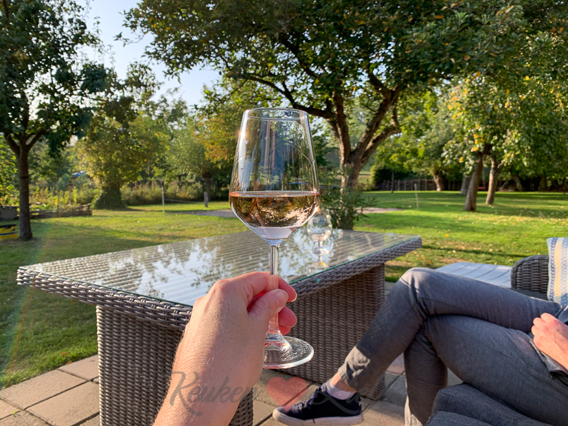 Voordat we binnen aan tafel gaan, genieten we eerst nog even buiten in het zonnetje van de laatste warme nazomerstralen.