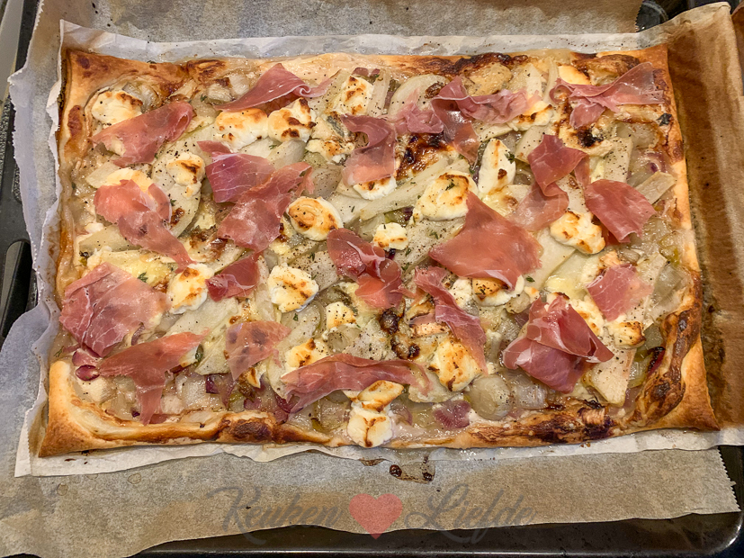 ’s Avonds eten we een lekkere bladerdeegplaattaart met gekarameliseerde witlof, zoete peer en blauwe kaas. Dit recept. Zó lekker! We hadden ook nog wat geitenkaas liggen dus die ging er ook op. De parmaham doen we er pas na het bakken op.