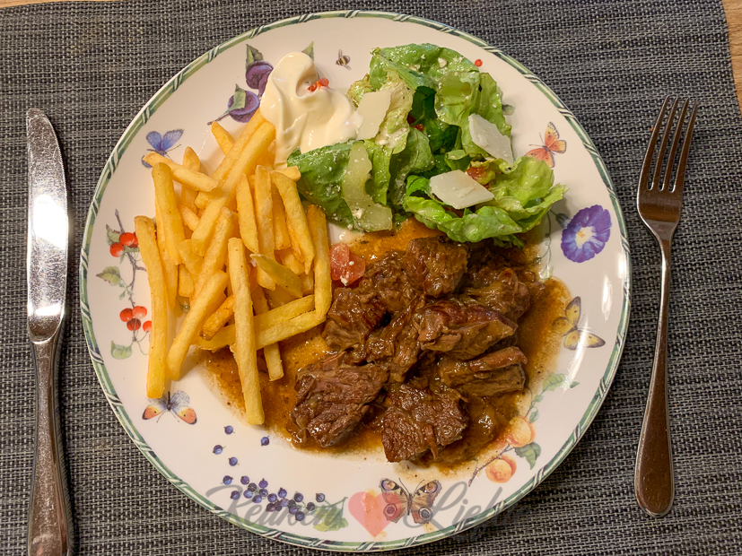 ’s Avonds genieten we van een heerlijk bordje Belgisch stoofvlees met salade, frietjes (helaas geen Belgische, maar Franse) en een lik Belgische mayonaise. Smullen!