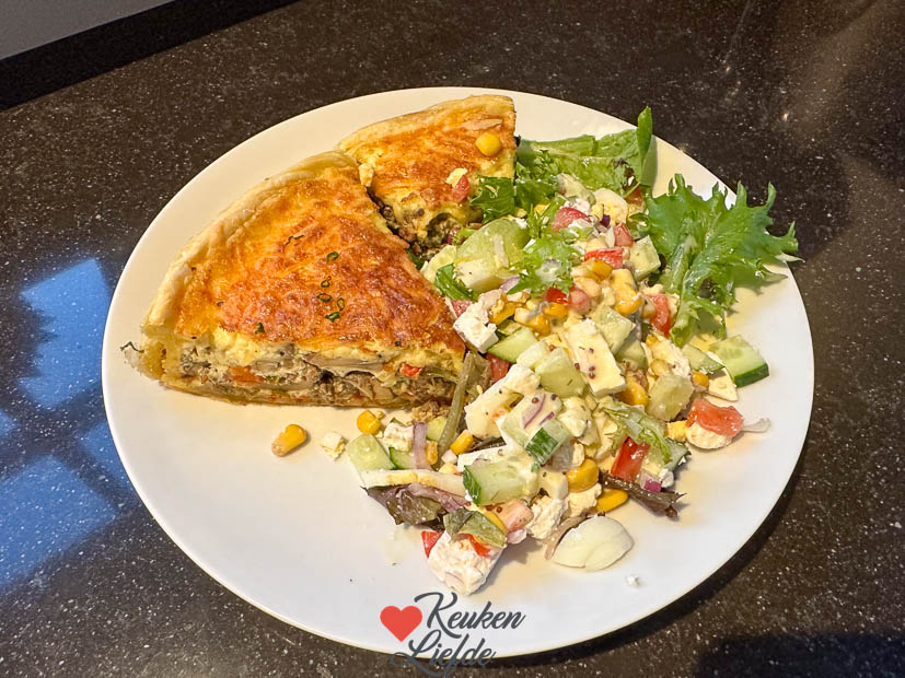 Ik heb een kookdag en maak twee recepten. Dat schiet lekker op zeg. Ze komen er dus snel aan! 😂 De hartige taart met gehakt en groenten warmde ik ’s avonds opnieuw op als avondeten. We maakten er een lekkere salade bij. De saladedressing maak ik altijd met een lepel mayonaise of halvanaise, zoetzuur augurkennat, honing en mosterd, gedroogde dille en een scheutje water. In plaats van mayonaise kun je ook olijfolie gebruiken.