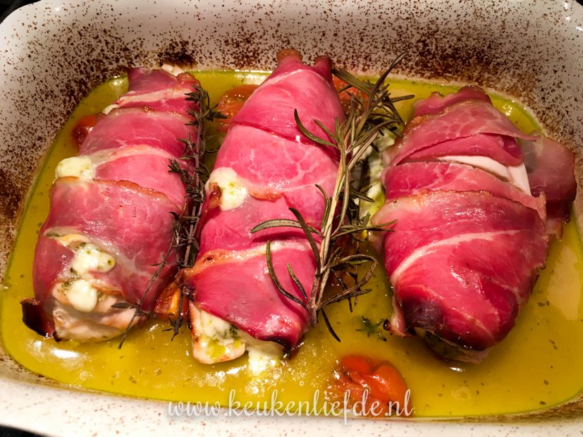 Ik maak (alweer) groentefrietjes — koolraab, pastinaak en wortel — en serveer ze dit keer met pesto en mozzarella gevulde kipfilet omwikkeld met rauwe ham uit de oven. (dit recept alleen dan met mozzarella erbij) Bij de kipfilet in de ovenschaal sprenkel ik wat witte wijn en olijfolie en ik leg er wat gehalveerde cherrytomaatjes en een takje tijm en rozemarijn bij. Zo krijg je een heerlijke jus.