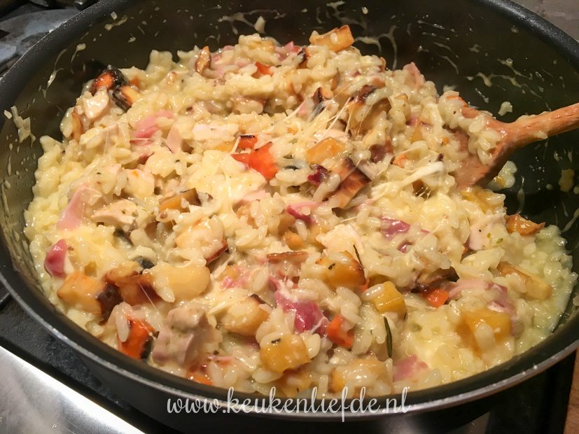 Ik heb nog een kipfilet, wat jus van de kip en groentefrietjes van gisteren over dus die mogen er ook in. Woah, dit was één van de lekkerste risotto’s die ik ooit gemaakt heb. Lang leve kliekjes!