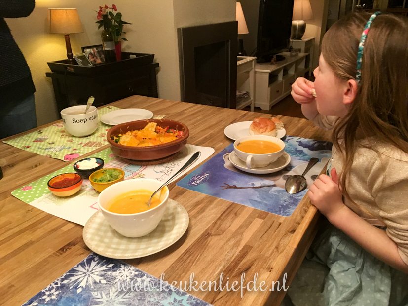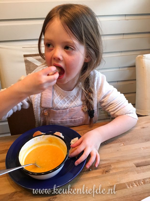 We eten ’s avonds de pompoensoep die vanaf nu de nieuwe soepfavoriet is van dochterlief.