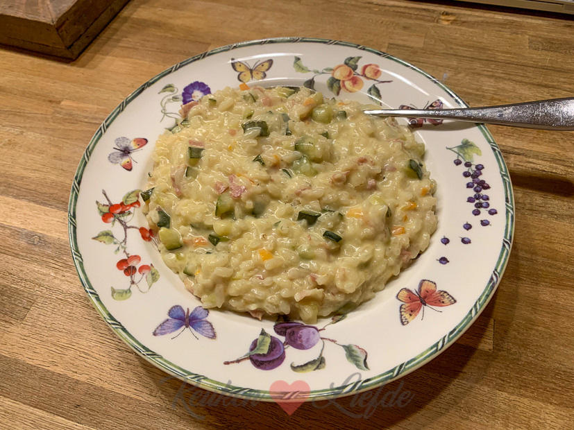 … Er ligt nog een grote courgette uit de moestuin die op moet. De laatste courgetteoogst van het jaar. (Heb ik je al verteld hoe geweldig het is om courgette te planten in je moestuin? We hebben er de hele zomer tot nu van kunnen oogsten!) Ik ga voor een romige risotto met courgette, wortel (ook uit eigen moestuin) en spekjes. Ik hou van dit soort eenpansgerechten. Bomvol smaak en zo makkelijk om te maken. Het perfecte comfort food! Een compleet vegetarisch hoofdgerecht, maar mocht je toch een stukje vis of vlees missen: gepaneerde witvisfilet of kipfilet, krokant goudbruin gebakken smaakt er heerlijk bij.