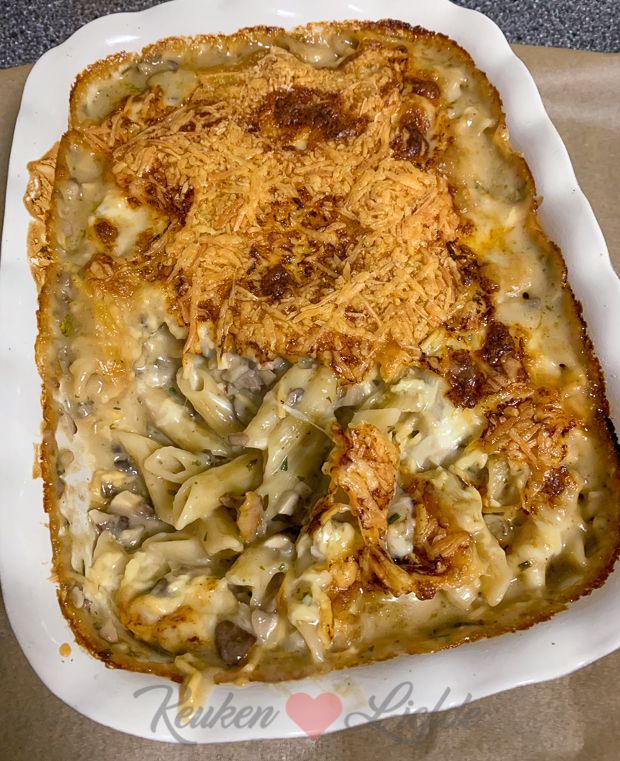Johan en ik eten later een pasta-ovenschotel met champignonroomsaus. Makkelijk om te maken want je hoeft de pasta niet eerst voor te koken, hij gaart vanzelf in de saus in de oven! Recept komt morgen online! 🙂