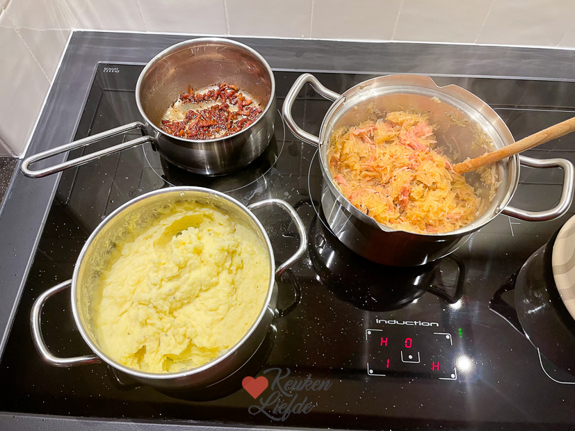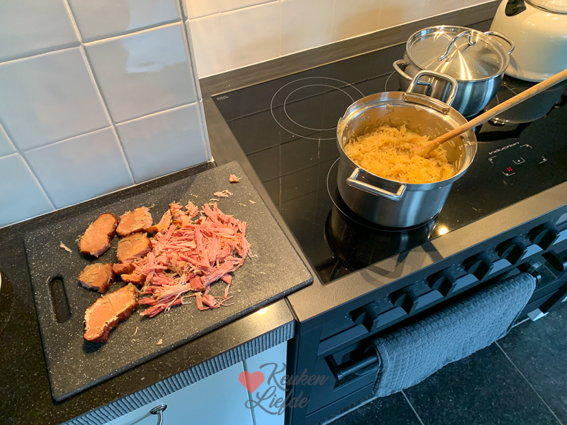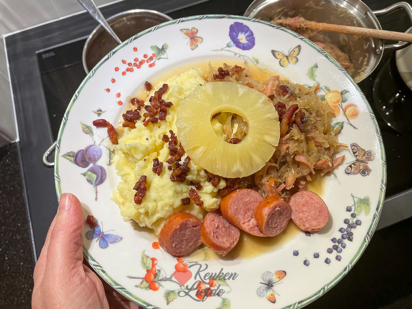 En weer een nieuwe week! Niet normaal toch, hoe snel de tijd gaat? Vandaag is weer een maandag zoals altijd. Johan en Ella zijn vroeg de deur uit en ik werk thuis op kantoor. ’s Middags maak ik zuurkool en zet hem op de foto zodat ik het recept met jullie kan delen. Ik bereid zuurkool anders dan de meeste Nederlanders en ik denk echt dat als je hem zo gegeten hebt, je nooit meer anders wil. ’s Avonds maak ik aardappelpuree, warm ik een rookworst op en bak ik spekjes uit om bij de zuurkool te serveren. Ook een plak ananas mag niet ontbreken. Gruwelijk lekker!
