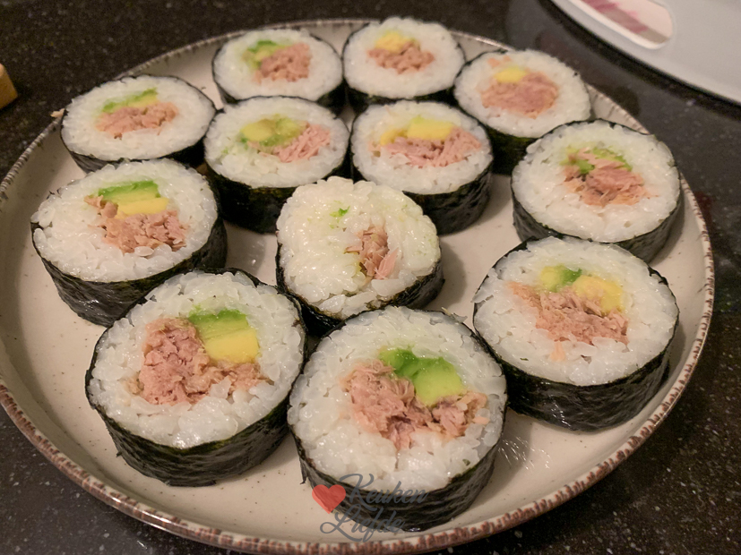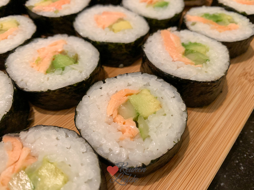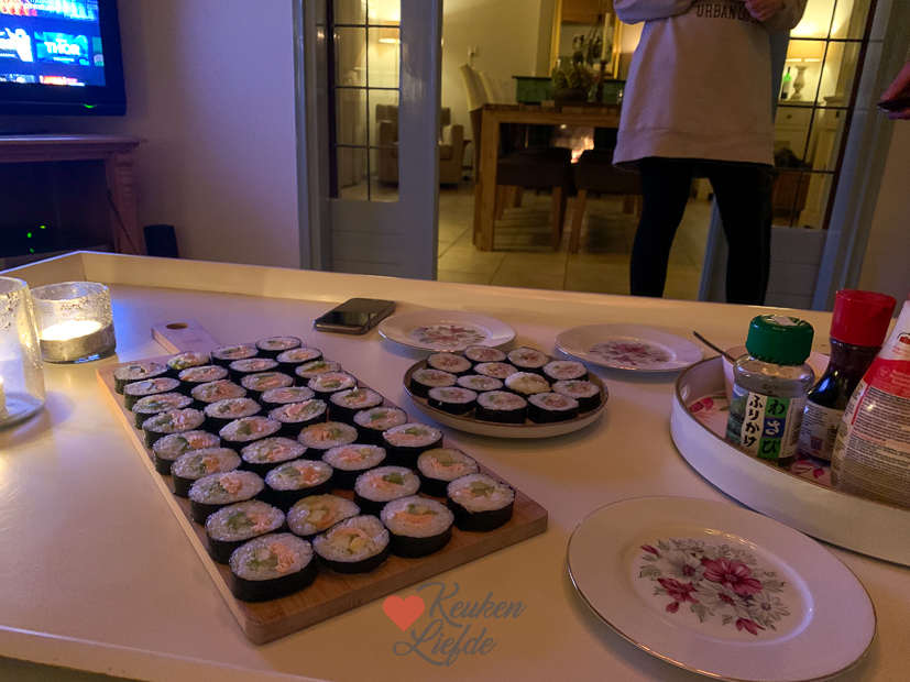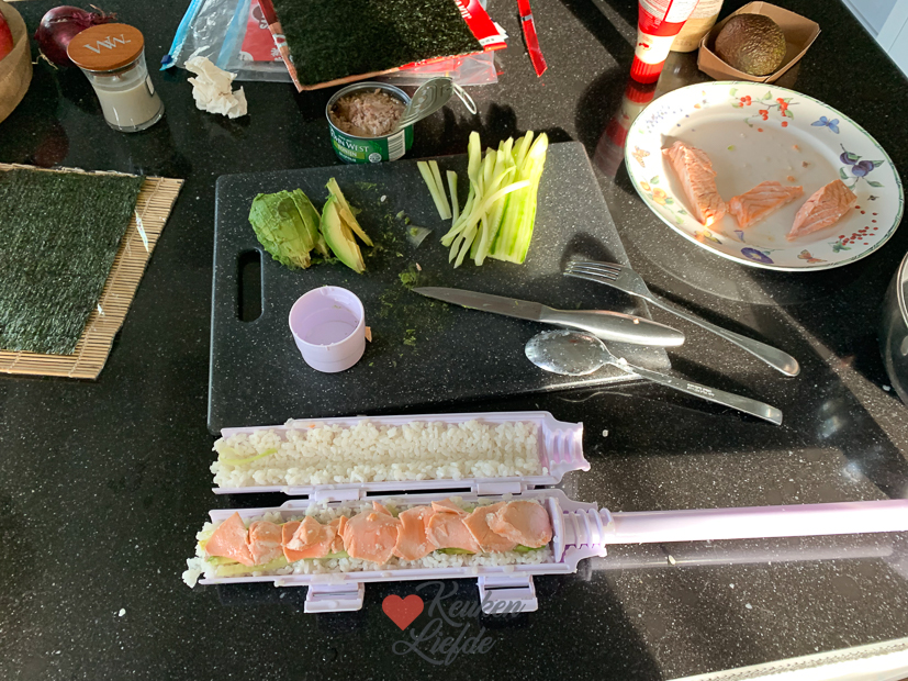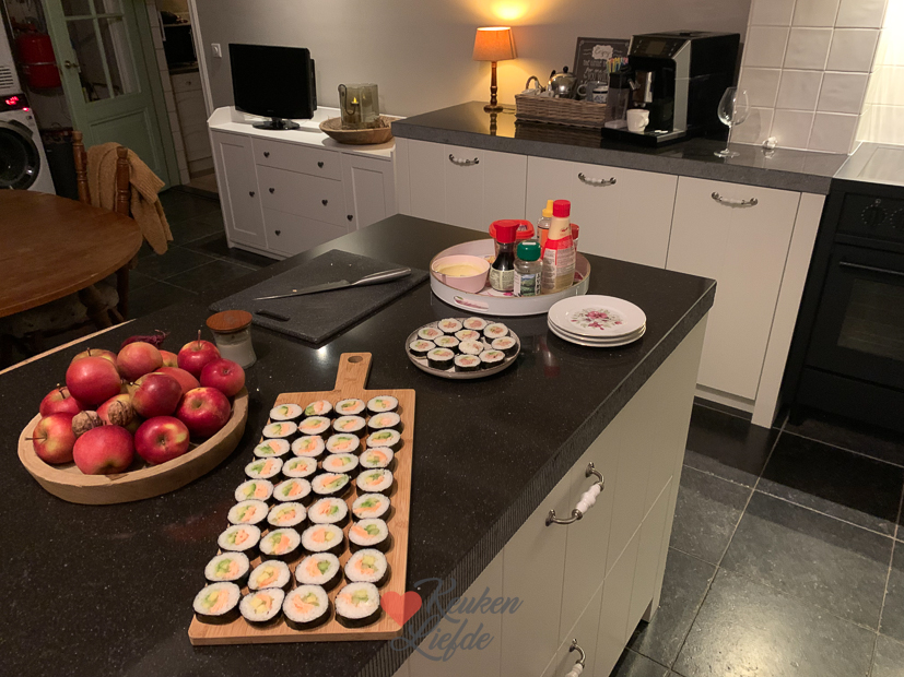 Het is heerlijk dat we eindelijk de tafel en stoelen voor in de keuken hebben uitgezocht want nu hebben we de zaterdag weer vrij voor andere dingen. Ella-Marie heeft ’s ochtends een uitwedstrijd van de voetbal en terwijl Johan even gaat kijken, maak ik nog snel een recept voor KL. Ik had deze week weinig voor KL gekookt en ik wil toch een voorraad opbouwen, zodat ik in december een beetje rustig aan kan doen. Als het KL-recept op de foto staat ga ik meteen door met het maken van een aantal sushirollen. Ella wilde graag weer eens sushi eten voor de tv met een filmpje. Ik hield de rollen dit keer eenvoudig en maakte twee varianten met in de oven gegaarde zalmfilet en tonijn uit blik. En verder avocado en komkommer. Als je niet van vis houdt kun je ze ook vullen met gerookte kip, of ze vegetarisch maken. De sushi zetten we op tafel met toppings: ingelegde gember, gefrituurde uitjes, furikake, Kewpie, sojasaus en wasabi. Iedereen legt dan wat sushi op zijn bord en doet er naar smaak toppings overheen. Om mooie sushirollen te maken gebruik ik deze sushimaker. Daarna duw ik de rol op een norivel en rol hem op. Daarna als een toffee strak inwikkelen in vershoudfolie en nog een paar uurtjes in de koelkast leggen. Dan kun je ze straks perfect snijden. Als de sushirollen in de koelkast liggen komt mijn broer nog even langs om appels te plukken. Eind van de middag gaat de houtkachel aan en is het tijd om te genieten.