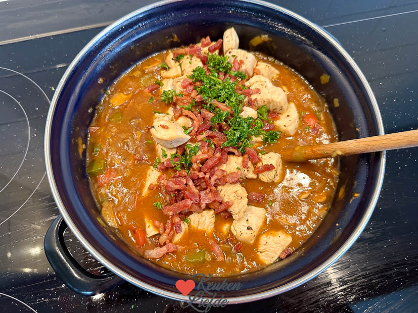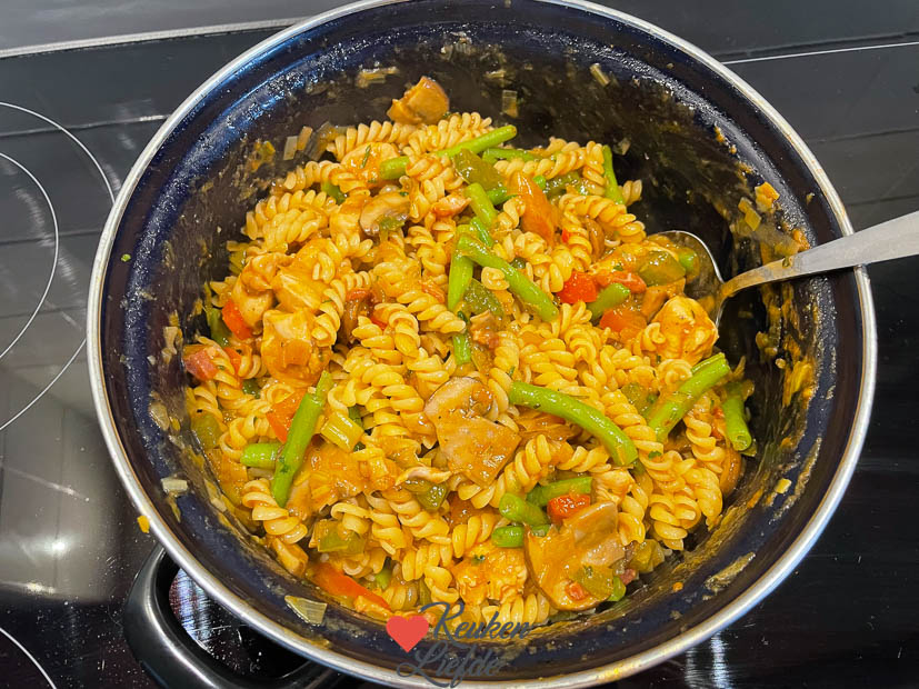 Johan heeft ondertussen Engels ponden gehaald voor onze tiener die volgende week met school naar London gaat. ’s Avonds warm ik het jachtpannetje opnieuw op en kook er wat pasta bij. Je kunt er trouwens ook gekookte of gebakken aardappels of rijst bij eten. Smaakt allemaal!