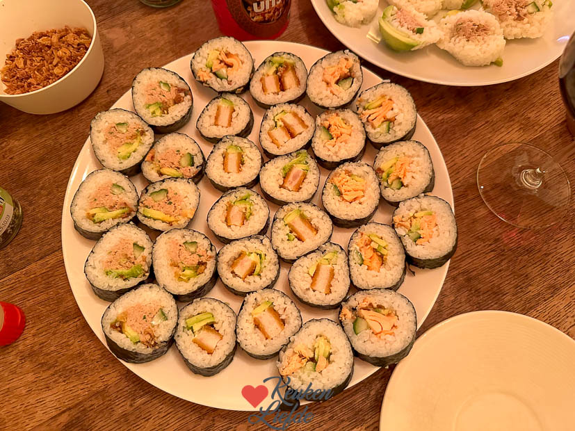 Ella-Marie kan ’s ochtends een beetje uitslapen maar niet te lang want begin van de middag heeft ze een voetbalwedstrijd. Gelukkig is het een thuiswedstrijd. Een paar uur later komt ze opgetogen weer thuis want ze hebben gewonnen! Als ze vervolgens ziet wat ik aan het maken ben kan haar dag niet meer stuk. Ik maak haar favoriete eten: sushi! Ik maakte drie verschillende rollen: met zalm (in de oven gegaard want rauwe sashimi vis is hier niet te krijgen), reepjes kipschnitzel en tonijnsalade. Het recept van onze favoriete sushirollen vind je in ons kookboek Familiegerechten! ’s Avonds houden we een filmavondje en komt de sushi op tafel. Ik had voor de laatste rol geen nori meer en probeerde een inside out rol te maken maar dat was geen succes. 😂 Gelukkig was er niks mis met de smaak.