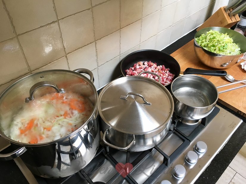 Johan gaat met Ella-Marie naar een uitwedstrijd voor de voetbal en ik ga thuis aan de slag met stamppot. Vanavond is het stamppotbuffet voor de verjaardag van mijn moeder en ik heb beloofd om twee stamppotten en rookworsten mee te nemen. Ik maak hutspot en andijviestamppot.