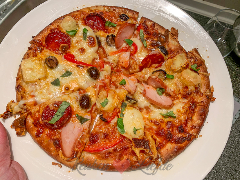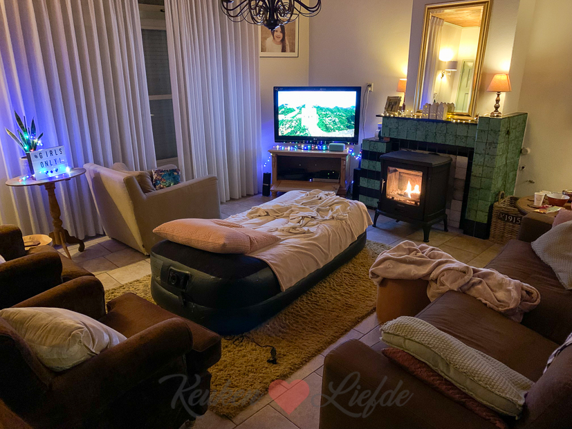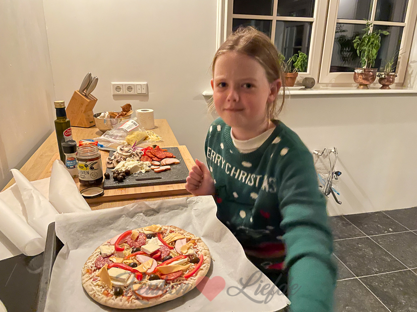 Ella heeft geen voetbalwedstrijd vandaag en dus kunnen we een keertje met z’n drieën op pad. We rijden naar de IKEA in Utrecht om even rond te neuzen en daarna mag Ella nog een uurtje springen in Jumpsquare in Nieuwegein. Op de terugweg naar huis halen we drie margherita-diepvriespizza’s en wat ingrediënten (gerookte kip, chorizo, paprika, champignons, ui, olijven en mozzarella) om ze extra te beleggen. Als we thuiskomen kleden we ons om, steken de houtkachel aan en beleggen de pizza. Daarna nestelen we ons op de bank voor de tv.