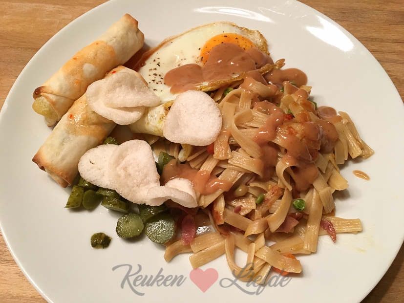 Het fijne van zo’n grote pan bami is dat je er twee dagen van kunt eten. Ik had nog even snel wat Vietnamese ovenloempia’s gehaald bij de supermarkt om erbij te serveren.
