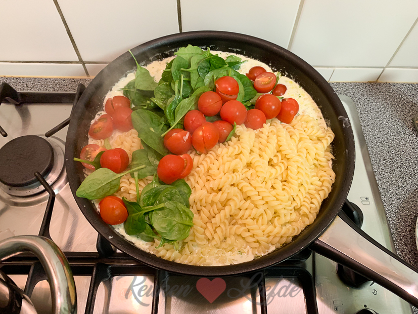 Kun je je dat grote stuk zalm nog herinneren dat we van Johan zijn ouders kregen? Ik heb het uiteindelijk toch in porties gesneden en in meerdere diepvrieszakken ingevroren. Drie porties zalm had ik bewaard in de koelkast voor vanavond. Ik maak een lekkere pasta met Boursin, spinazie en tomaten en daarbij de zalm die ik bestrijk met pesto en bak in de oven.