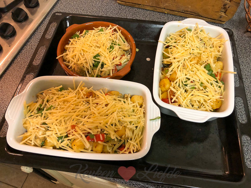 Het fijne van grote eenpansgerechten is dat wij er met ons drieën makkelijk twee dagen van kunnen eten. Vandaag hoef ik dus alleen maar op te warmen. Op mijn portie gaat nog een extra klodder zure room en wat Parmezaan. Tja, wat zal ik zeggen. Zo ben ik. Ze noemen me ook wel mevrouw Klodder.