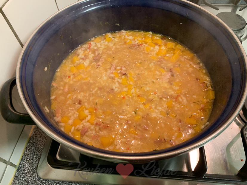Tijd om aan de slag te gaan met het avondeten. In de kelder ligt nog een prachtige flespompoen die we kregen van Johan zijn tante en ik heb ook nog spinazie en cherrytomaten in huis. Ik besluit een romige (wat is een leven zonder room?) pompoenrisotto te maken met spekjes, spinazie en tomaatjes. Ella-Marie eet al eerder omdat ze op tijd naar voetbaltraining moet. Johan en ik eten de risotto ’s avonds op de bank voor de tv. Guilty pleasure!