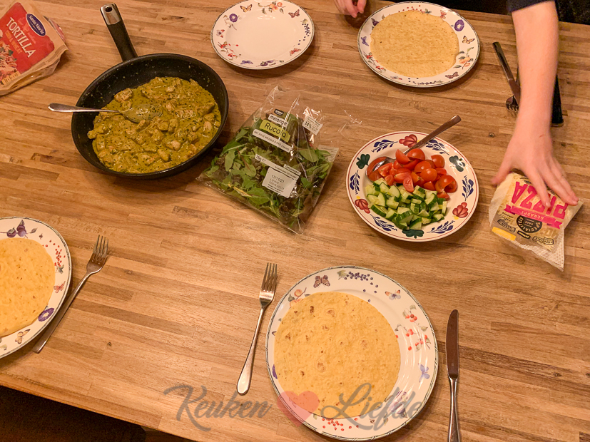 Het is vandaag 11 november en precies 9 jaar geleden dat ik mijn allereerste recept op KeukenLiefde deelde: hartverwarmende kippensoep! Al negen jaar lang dat ik elke dag een recept met je deel! Zijn jullie me nog niet zat…? 🙂 Voor de gelegenheid deelde ik op IG een winactie waarbij je allebei onze kookboeken kon winnen. De winnaar van de winactie is inmiddels bekend gemaakt en de boeken zijn verstuurd. Gefeliciteerd! Veel kook- en smulplezier ermee! ’s Avonds wil ik iets lekkers eten dat snel klaar is. Ella moet op donderdag namelijk om half zeven op de voetbaltraining zijn en dus is er enige haast bij. Ik maak een koekenpan vol met kip in pestoroomsaus en serveer die met wraps, sla en rauwkost. Recept staat niet op KL trouwens. Liefhebbers? Laat het me weten, dan maak ik hem binnenkort nog een keer voor de website. In plaats van wraps kun je ook pasta of gebakken aardappels met de kip serveren. Ook lekker met broccoli erbij.