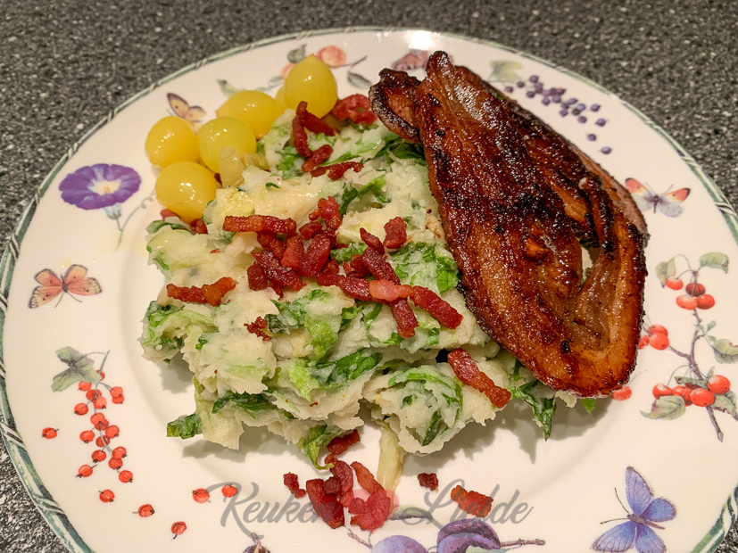Na een aantal kookdagen bij mijn ouders thuis heb ik vandaag weer een kookdag in mijn eigen keuken. Ik ga onder andere aan de slag met een kersttaart. Als de keuken weer is opgeruimd ga ik meteen verder met het avondeten. Op het menu vanavond staat rauwe andijviestamppot met uitgebakken spekjes en gebakken speklap. Het plan was eigenlijk om Indische speklapjes in ketjapsaus te maken maar uiteindeijk had ik toch meer zin in een simpel gebakken speklapje. Zoetzure Amsterdamse uitjes maken het voor mij echt af. Het smaakte ouderwets lekker.