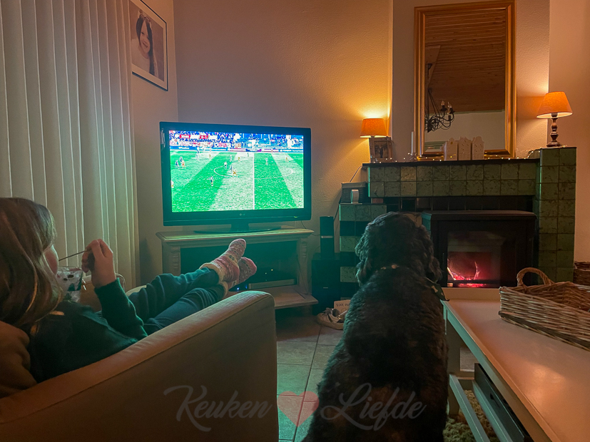 Terwijl Johan en Ella op het voetbalveld zijn, sta ik weer in de keuken. Ik maak nog een nieuw recept en leg de laatste hand aan de taart die ik gisteren maakte. Daarna zet ik ze op de foto en ruim de keuken weer op. Als Johan en Ella thuiskomen kunnen ze meteen een stukje taart proeven. De rest van de middag rommelen we wat in en rondom huis en kijken we de aankomst van Sinterklaas in Nederland op tv terug. Eind van de middag wordt er lekker gewandeld met Nacho en daarna kleden we ons om en steken de houtkachel aan. Het is nog steeds erg koud in huis omdat de vloerverwarming nog niet vol aan mag in verband met het drogen van de lijm. Het avondeten is simpel maar lekker: brood belegd met carpaccio, een ovenkroket en een gebakken ei. Na het eten kijken we de wedstrijd van het Nederlands elftal. Daar zullen we het verder maar niet over hebben… Oh en vooruit, de schoen mag ook gezet worden… Blijft toch leuk.