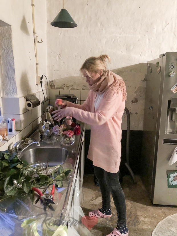 Ik ben jarig vandaag en mag alweer achtendertig kaarsjes uitblazen! Ouwe taart… Over taart gesproken, in plaats van zelfgebakken taart haal ik een slagroomschnitt bij de Jumbo en duik ik met een flinke homp en een extra large cappuccino achter mijn computer om te werken. De hele dag! Zielig hè, haha! Niet echt hoor, want werken voor KL vind ik leukste dat er is. Van Johan en Ella krijg ik een grote bos met achterdertig rozen! De bos is zo groot dat ik er een grote en kleine vaas mee kan vullen. Hieronder sta ik ze te rangschikken op de deel. Haha, daar was ik wel even zoet mee… De deel in ons huis is trouwens de plek waar in de (hopelijk nabije) toekomst mijn droomkeuken moet komen…