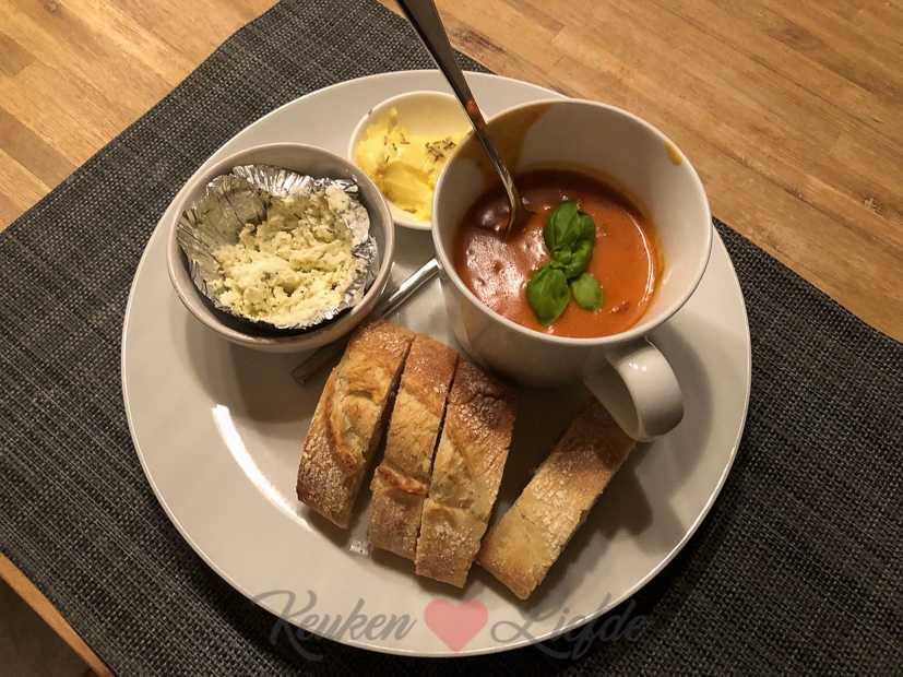 Voor mijn verjaardagsmaal maak ik pizzadeeg zodat we vanavond homemade pizza kunnen eten. Ella-Marie maak ik daar nog steeds niet blij mee, dus die krijgt een kommetje zelfgemaakte, verse tomatensoep met vers afgebakken stokbrood en kruidenboter. Iedereen blij. Bij de pizza trekken Johan en ik een lekkere fles Barolo open. 🙂