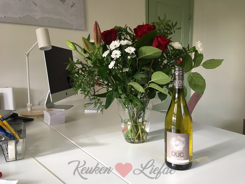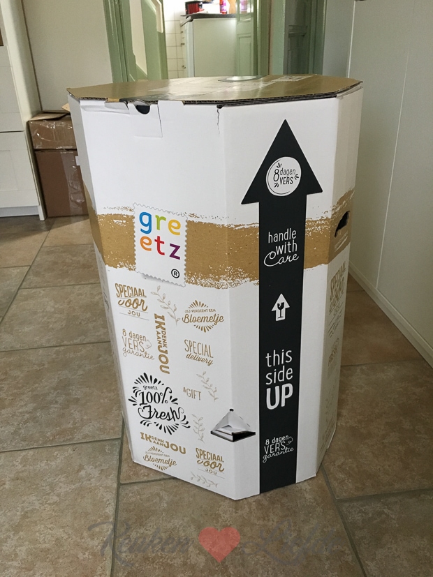 Van mijn mediabureau ontvang ik dit grote pakket voor mijn verjaardag. Een mooie bos bloemen en een fles wijn. Superleuk!