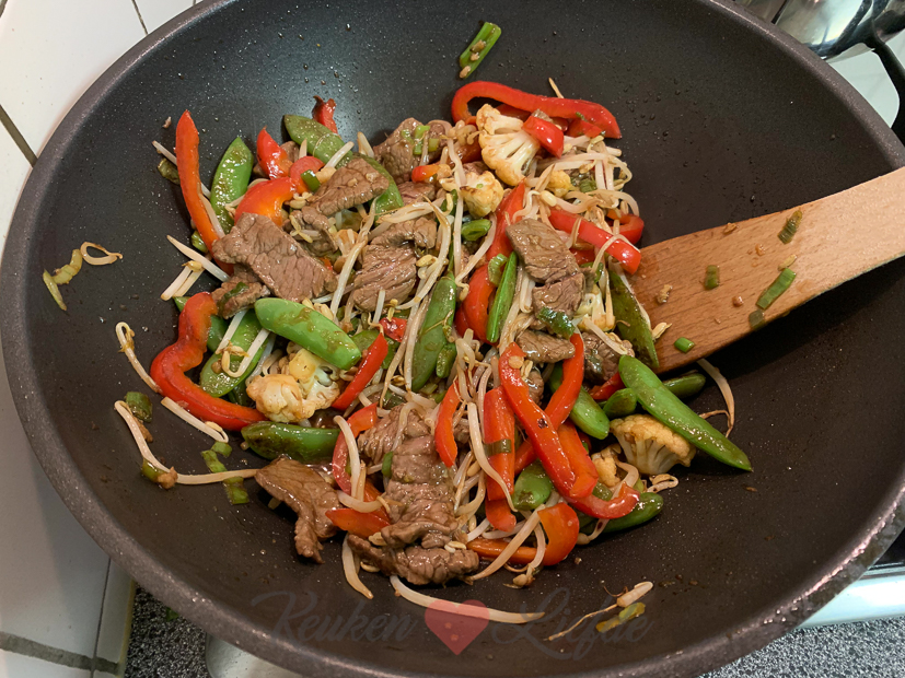Na al die verwennerij van het afgelopen weekend heb ik ’s avonds zin in een maaltijd met veel verse groente. Ik maak een wokschotel met biefstukreepjes, bloemkoolroosjes, paprika, sugarsnaps en taugé. De biefstukreepjes laat ik van tevoren even marineren in een teentje uitgeperste knoflook, een tl versgeraspte gember, een scheut sojasaus en een druppel sesamolie. De woksaus maak ik van 4 el sojasaus, 2 el oestersaus, 1 el rijstazijn en een drupje sesamolie. Ik begin met het wokken van de biefstuk, heel kort. Dan laten uitlekken in een vergiet. Vocht opvangen! Wok schoonvegen en de groenten kort wokken (de bloemkool en sugarsnaps moeten het langst dus die gaan het eerste in de pan, dan de paprika en dan tauge). Ook eruit en bij de biefstuk in het vergiet. Dan de woksaus en het opgevangen kookvocht van het vlees en de groente in de wok en even laten inkoken. Biefstuk en groenten erdoor (en eventueel een flinke hand fijngehakte koriander of peterselie) en kort even opwarmen. Ik kookte er pandanrijst bij. Lekker, makkelijk en gezond!