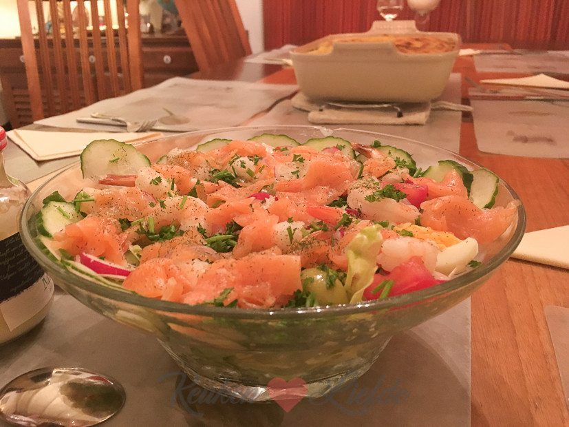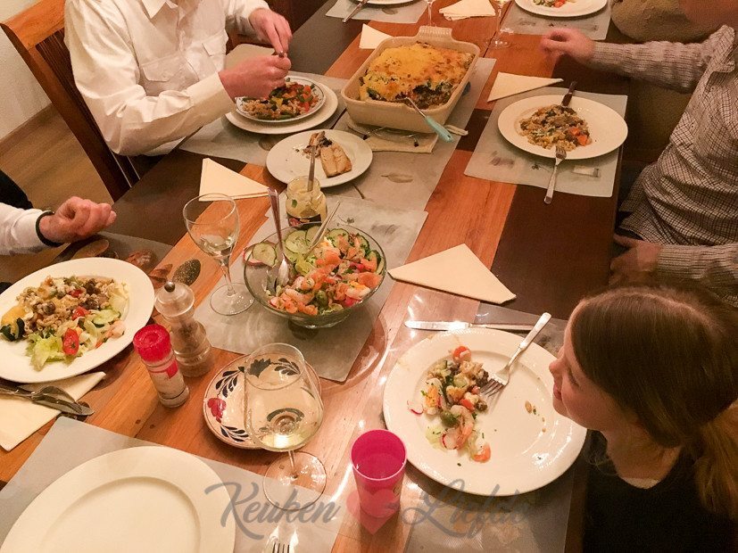 Na alle verwennerij en het uitpakgeweld gaan we lekker een hapje eten. Johan zijn moeder heeft allemaal lekkere dingen op het aanrecht uitgestald en iederaan kan zichzelf bedienen.