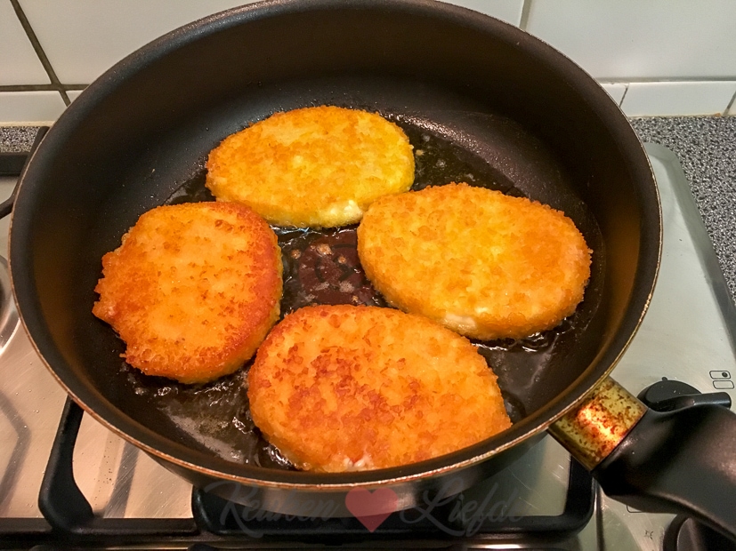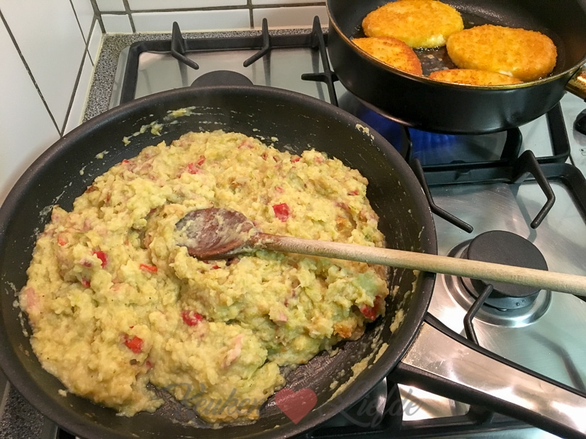 Ik heb nog een restje spruitjesstamppot in de koelkast liggen die ik opbak in de koekenpan voor het avondeten. Ik bak er ook nog gepaneerde kaasschnitzels bij. Lekker!
