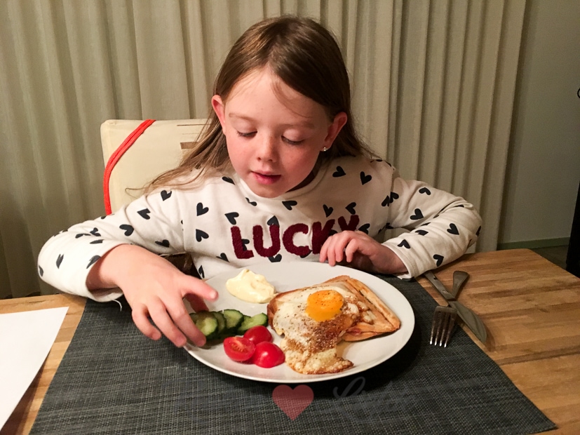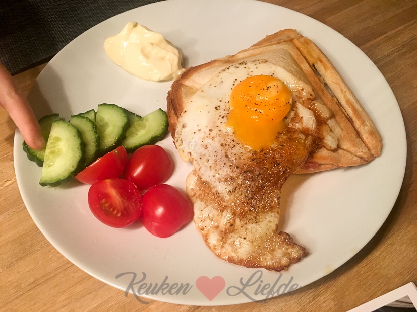 Soms heb je van die dagen dat een simpele tosti met ham en kaas en een gebakken ei bovenop het hoogst haalbare is. Simpel of niet, lekker is het wel. De Fransen noemen dit een croque-madame. Chique naam of niet, onze kleine madame houdt er ervan! 🙂