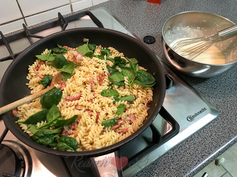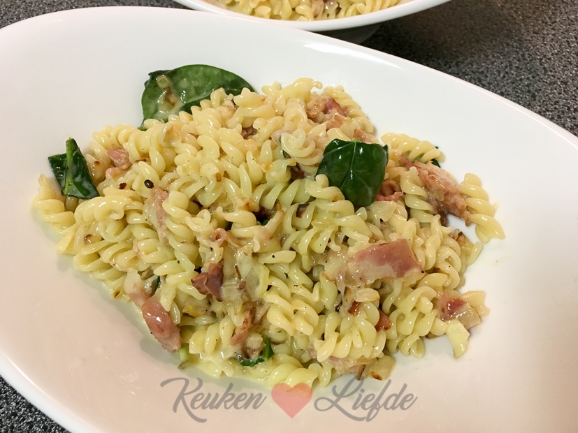 Voor het avondeten maak ik pasta carbonara met spinazie. Dit recept maar dan met mini fusilli in plaats van spaghetti en de saus verrijkt met een vleugje room en babyspinazie. Jumm!
