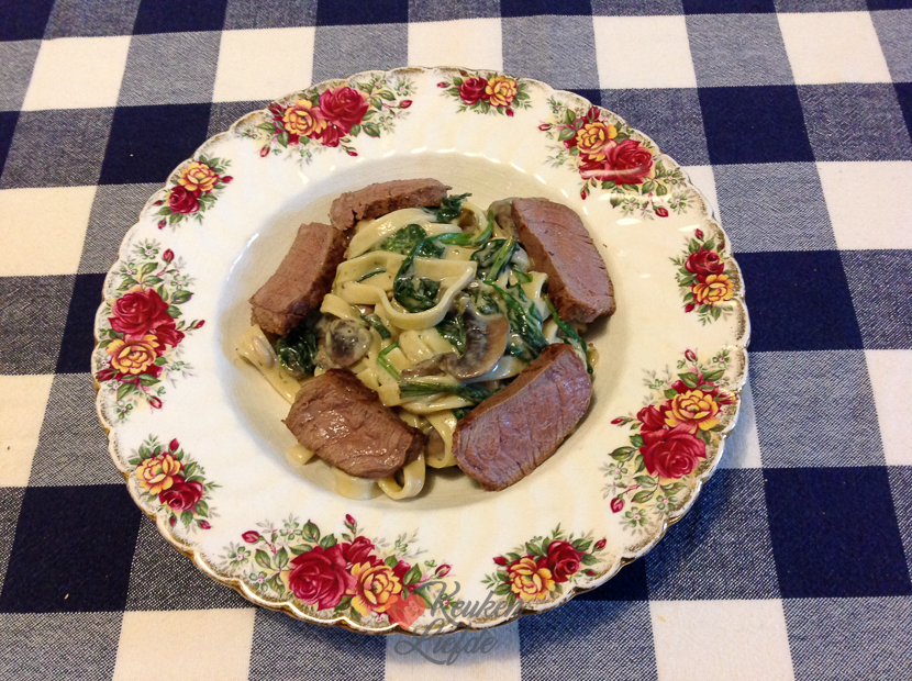 - Tagliatelle met roomsaus uit ons kookboek Familiegerechten geserveerd met biefstuk