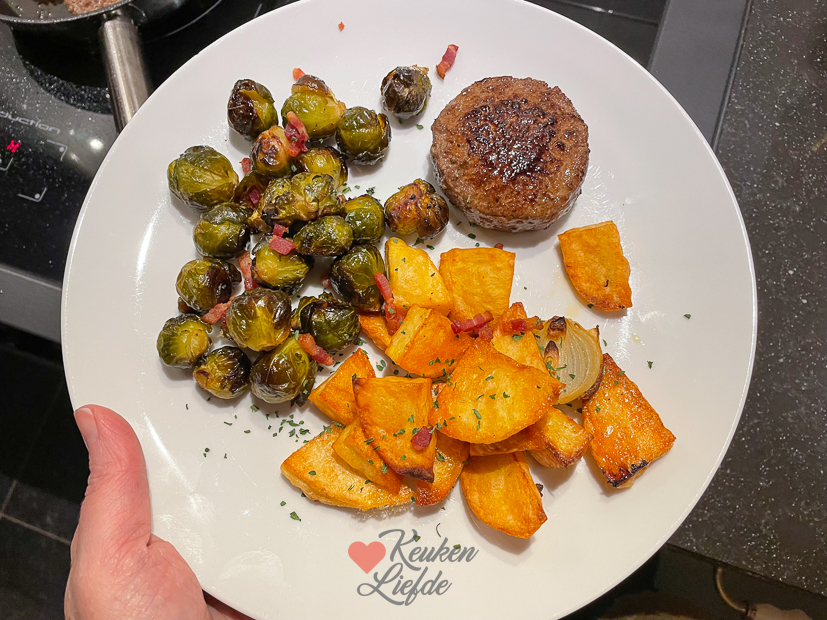 - Ovenaardappels en -spruitjes en gebakken tartaar.